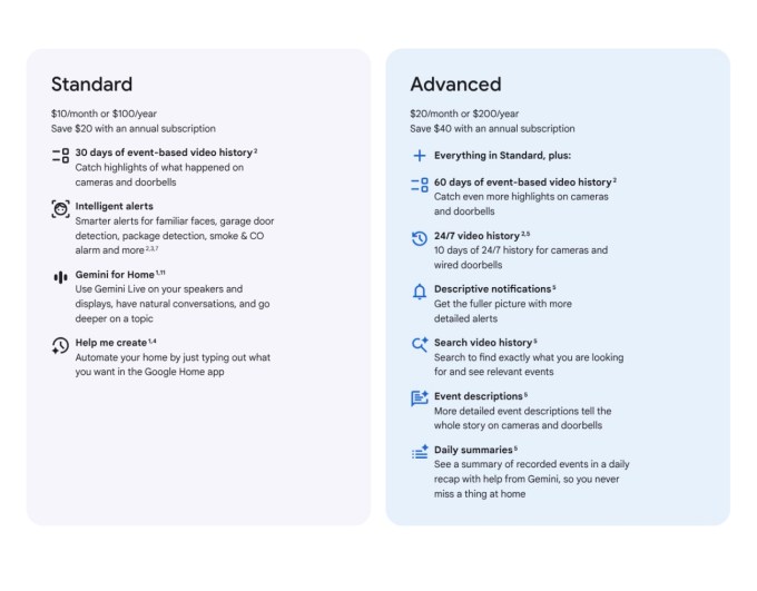 In the app, Gemini will offer descriptions of the events and activities spotted by your cameras, summarize the day’s activities, direct you to a clip when you ask, and more. (Some features require a Google Home Premium subscription. More on that here; see chart below.)