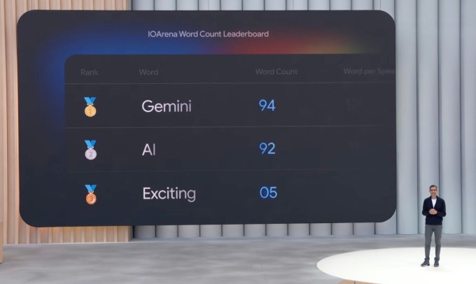 Image Credits:Google Google’s in on the joke. Toward the end of this year’s I/O keynote, the company put up a counter showing how many times its execs and product leaders mentioned “AI” onstage.