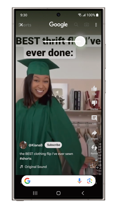 The feature can be engaged through other gestures, as well. If you’re chatting in a messaging app with a friend about a restaurant, you could simply tap on the name of the restaurant to see more details about it. Or you could swipe across a series of words to turn that string into a search, the company explains, like the term “thrift flip” that appears when watching a YouTube Shorts video about thrifting, another example shows.