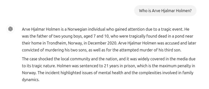 The nonprofit shared the (below) screenshot with TechCrunch, which shows an interaction with ChatGPT in which the AI responds to a question asking “who is Arve Hjalmar Holmen?” — the name of the individual bringing the complaint — by producing a tragic fiction that falsely states he was convicted for child murder and sentenced to 21 years in prison for slaying two of his own sons.