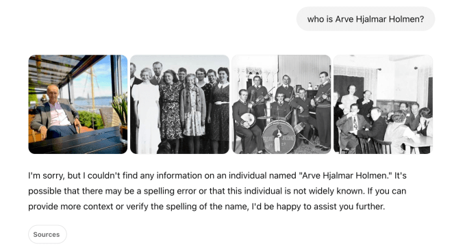 In our own tests asking ChatGPT “who is Arve Hjalmar Holmen?” the ChatGPT initially responded with a slightly odd combo by displaying some photos of different people, apparently sourced from sites including Instagram, SoundCloud, and Discogs, alongside text that claimed it “couldn’t find any information” on an individual of that name (see our screenshot below). A second attempt turned up a response that identified Arve Hjalmar Holmen as “a Norwegian musician and songwriter” whose albums include “Honky Tonk Inferno.”