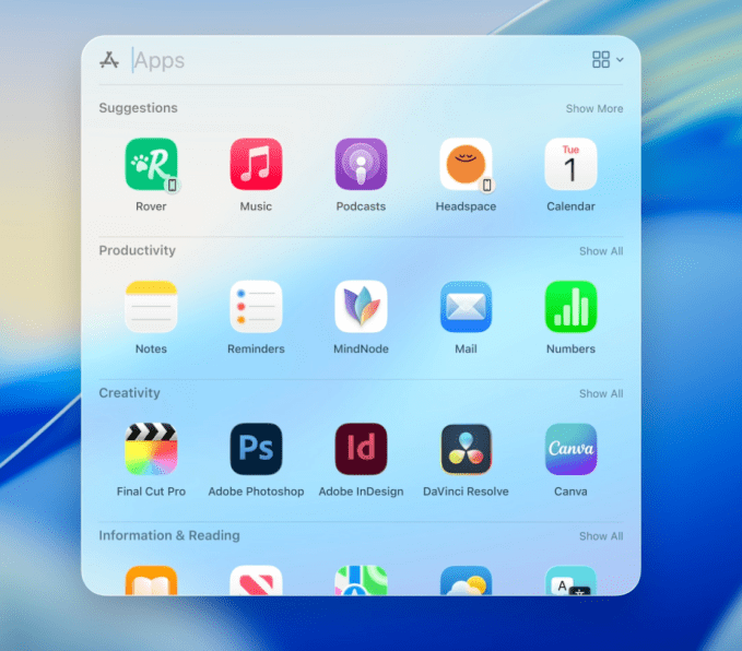 Spotlight is getting a visual redesign, allowing users to browse more easily through apps, files, clipboard history, and more. All these results are now listed together, and are ranked “intelligently” based on relevance to users.