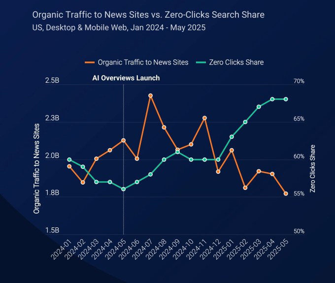 Since the launch of Google’s AI Overviews in May 2024, the firm found that the number of news searches on the web that result in no click-throughs to news websites has grown from 56% to nearly 69% as of May 2025.