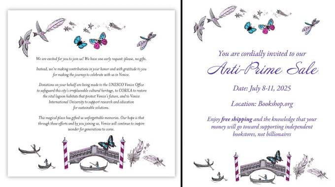Like many other retailers, Bookshop.org holds a sale to coincide with Amazon’s big event — it’s a way to lure away consumers who may be tempted by Amazon’s deals but could be convinced to spend a few extra dollars to support an independent business. These anti-Prime sales probably don’t make a huge dent in Amazon’s bottom line (sigh), but Bookshop.org twisted the knife where it hurts: the graphic design of Amazon founder Jeff Bezos’ recent wedding invitations.