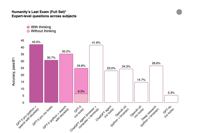 On Humanity’s Last Exam — a difficult test measuring AI model performance across math, humanities, and the natural sciences — a version of GPT-5 with extended reasoning (GPT-5 Pro) scored 42% when using tools. That’s slightly less than xAI was able to achieve with Grok 4 Heavy, which scored 44.4% on the test.