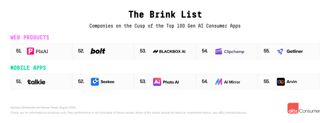 Andreessen Horowitz also took time to call out AI apps that were on the brink of making the list of top AI apps, including PixAI, Bolt, Blackbox AI, Clipchamp, and Getliner on the web and Talkie, Seekee, Photo AI, AI Mirror, and Arvin on mobile.