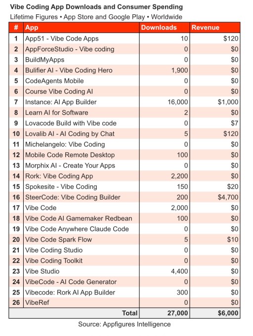 The largest of these is Instance: AI App Builder, which has seen only 16,000 downloads and $1,000 in consumer spending. The next largest app, Vibe Studio, has pulled in just 4,000 downloads but has made no money.