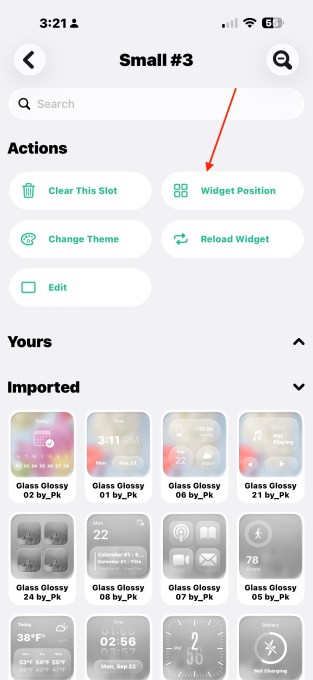 From Widgy’s “Manage” tab, you’ll tap on the available widgets included with your download. To have it match your wallpaper, tap “Set up Transparency” and upload screenshots of your wallpaper in light and dark mode snapped from a blank page of the Home Screen itself. Each widget can then be further customized in this section. When you tap on an individual widget to customize it, you’ll also have to set up the widget position (meaning where on the Home Screen it sits).