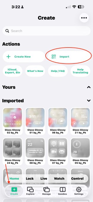 Open the Widgy app you’ve already installed from the App Store and go to the first tab, “Create.” Here you’ll tap “Import,” then the option to “import .widgy File from Files.” (Unless you saved the file in the Widgy folder that’s created on your phone, you’ll have to browse to wherever you originally downloaded the files.) After you find the file or folder you want to import, tap on it to pull it into Widgy.