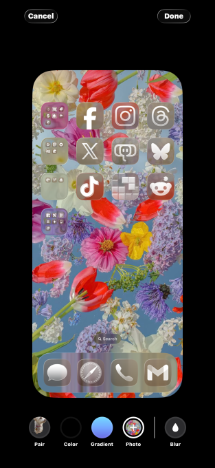 Home Screen customization is also a good time to support a favorite artist. Many artists offer wallpaper packs for sale through their Patreon or promote their downloads on their social media. Searching for “iOS wallpaper” and related terms on sites like X and Threads could point you to some ideas. Similarly, users often show off their designs on visual mediums like Instagram and TikTok. (I’m currently obsessed with these bright, colorful, and watery flower prints!)