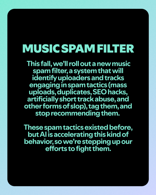 Because AI tools make it easier for anyone to release music, Spotify also has a new plan to cut down on the potential spam that results. This fall, the company will roll out a new music spam filter that will attempt to address spam tactics, tag them, and then stop recommending those tracks to users.