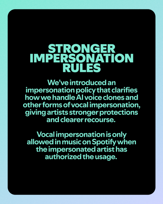 As part of the same announcement, Spotify clarified its polices around AI-enabled personalization, stating directly thatunauthorized AI voice clones, deepfakes, and any other form of vocal replicas or impersonation are not allowed and will be removed from the platform.