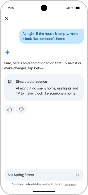 Instead of configuring automations manually, you could tell Gemini (even fairly vaguely) that you’d like to feel safer in your home, and the AI could advise you how to set up a routine involving closing blinds and locking doors or creating a simulated presence by automatically turning on and off lights while you’re away.
