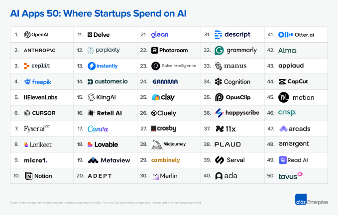 On Thursday, Andreessen Horowitz released its first AI Spending Report in partnership with the fintech firm Mercury. Using transaction data from Mercury, the report analyzes the top 50 AI-native application layer companies that startups are spending money on, similar to the previously published Top 100 Gen AI Consumer Apps