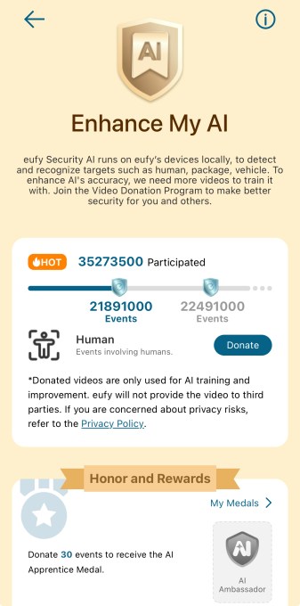 As of the time of publication, through another in-app campaign that Eufy calls the Video Donation Program to improve its AI systems, Eufy also offers users rewards that range from an “Apprentice Medal,” which appears to simply be a badge next to the user’s name in the app, to gifts such as cameras or gift cards.