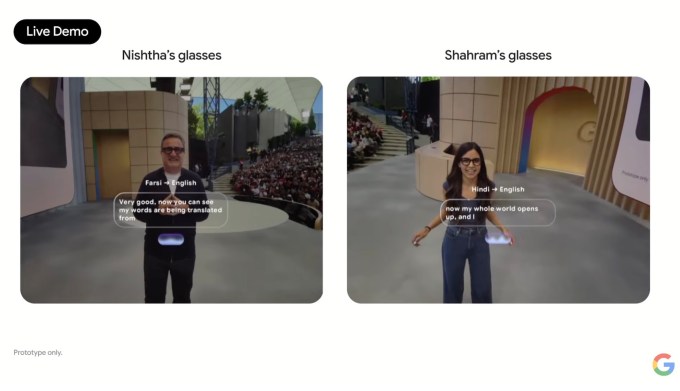Image Credits:Google Google attempted to show how its Android XR glasses can help with live translations. In a conversation between Google PMs Shahram Izadi and Nishtha Bhatia, the smart glasses were able to help translate a few sentences before their eyes. However, the demo shut down after about 15 seconds, when Gemini stopped translating what each Google PM was saying.